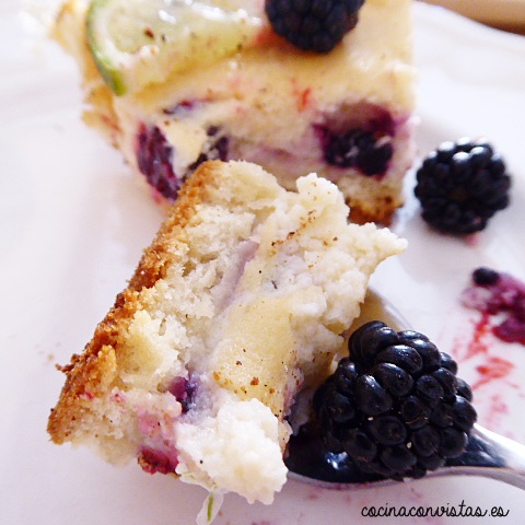 En un bol batimos el huevo con el azúcar y cuando blanquee añadimos el queso crema y el tofu y mezclamos bien a esto le ponemos la ralladura de lima, la harina y la nata (crema de leche) y lo mezclamos bien, hasta obtener una crema homogénea. Finalmente incorporamos las moras lavadas y secas.