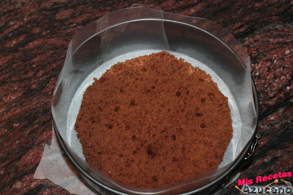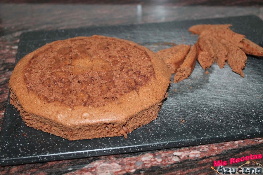 Cogemos el bizcocho que ya lo tendremos frio, lo partimos por la mitad sacando dos discos, ponemos uno encima del otro y le cortaremos por todos los filos 1 centímetro alrededor.