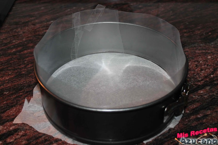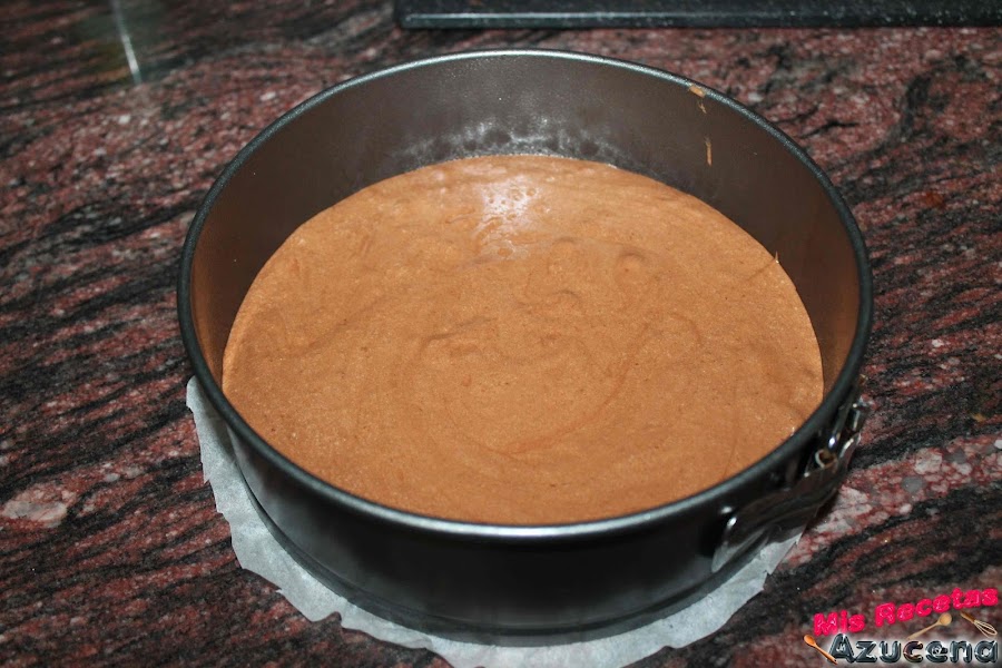 Por último añadiremos las claras que tenemos levantadas y con ayuda de una lengua lo mezclaremos todo con movimientos envolventes.El molde que yo he utilizado es de 20 centímetros de diámetro, lo prepararemos poniendo una lámina de papel vegetal en la parte de abajo y por los lados pondremos spray antiadherente o en su caso mantequilla y harina.