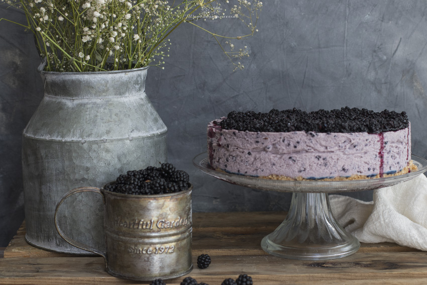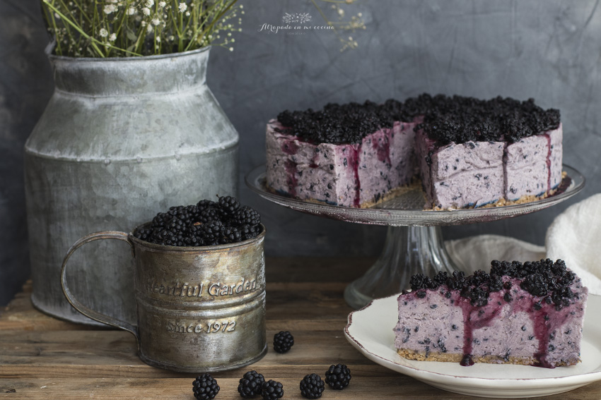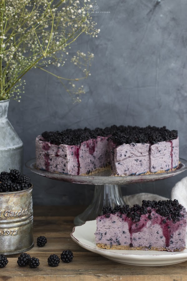 Hace unas semanas mis amigas de Plain & Simple me regalaron un cubo de moras y ante tan suculento regalo no me podía resistir a preparar un delicioso postre, eso si, después de comerme medio cubo mora a mora, je,je.... Bueno ellas preparan con estas moras una carne de moras espectacular que comercializan y está riquísima tanto en platos dulces como salados. La tarta que he preparado es muy básica, una base de galletas azucaradas, mascarpone, nata (crema de leche) y moras en el interior y una cobertura de mermelada de moras.