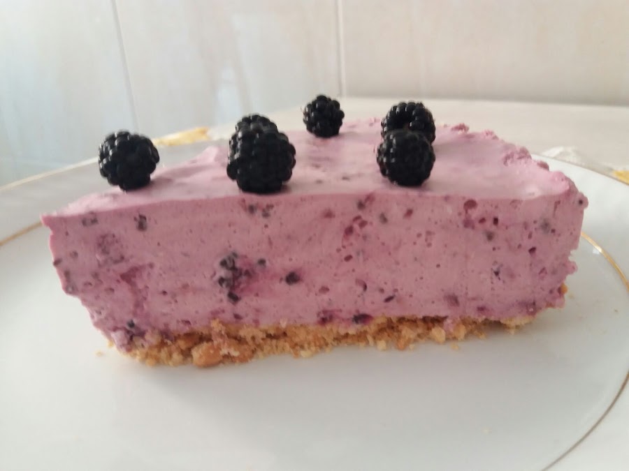 Lo primero fue preparar un almíbar con las moras. En un cazo puse a fuego medio las moras con el azúcar, durante unos 10 minutos hasta que se disolvió y se formó el almíbar. Lo retire del fuego, lo triture y lo reserve.