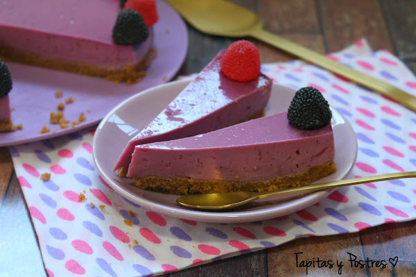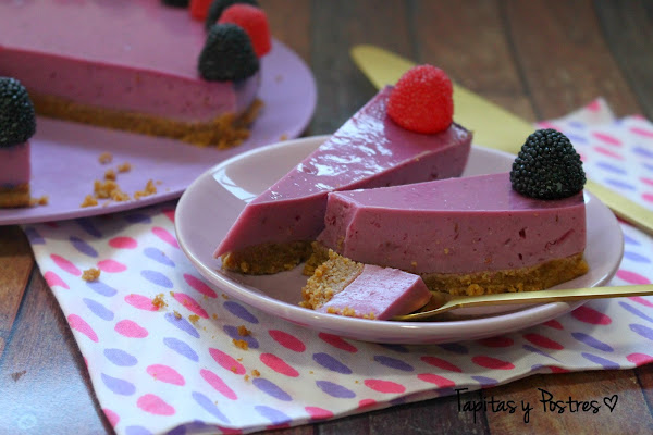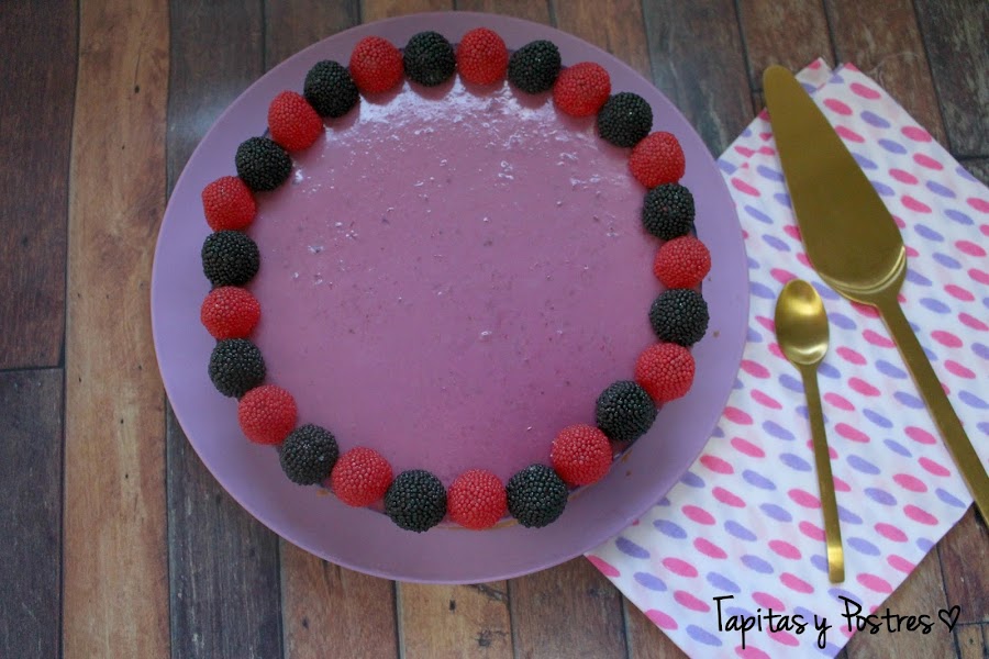 Esta en concreto está hecha con moras, de ahí ese color morado tan chulo y tiene un sabor suave y muy rico. Yo ya la he preparado para mi cumpleaños, que es hoy. A ver si a vosotros os convence.
