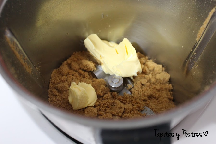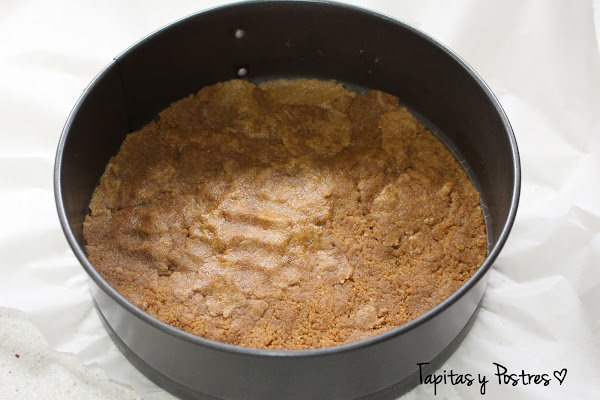 Comenzamos triturando las galletas en el vaso de la thermomix unos 15 segundos a velocidad 7-10. Añadimos la mantequilla blanda y mezclamos 10 segundos a velocidad 4. Ponemos esta mezcla en el fondo de un molde desmoldable y aplastamos para que quede compacta. Reservamos en la nevera.