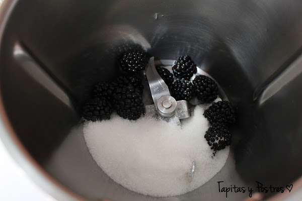 Colocamos las moras y el azúcar en el vaso de la thermomix y trituramos hasta hacerlo un puré líquido, unos 20 segundos a velocidad 8-10