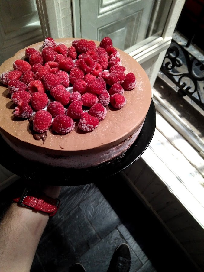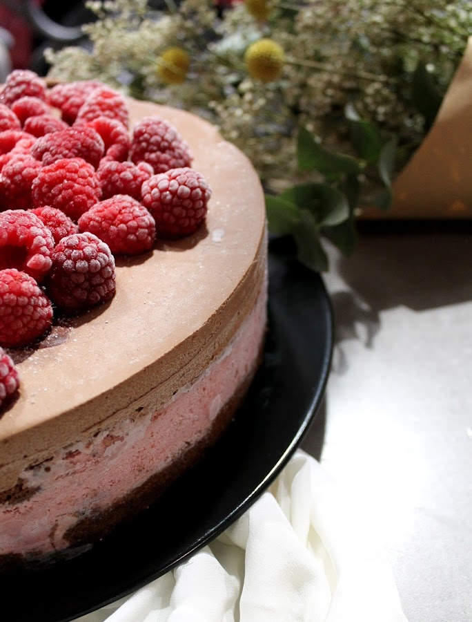 Sobre la mousse de frambuesas colocamos la otra mitad del bizcocho. Y sobre el la mousse de chocolate. Llevamos de nuevo al congelador para que se cuaje bien y luego además sea más fácil de manejar la tarta para poner en un plato.