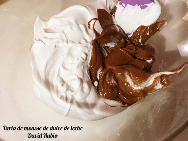 Cuando veamos que ya no está caliente el dulce de leche, lo verteremos sobre nuestra nata montada (crema de leche) e iremos integrándolo con movimientos envolventes, de abajo hacia arriba.