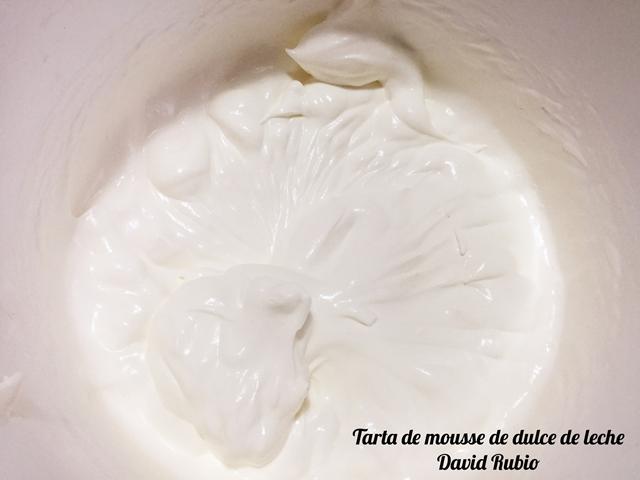 Montamos la nata (crema de leche), que debe estar muy fría para asegurarnos que monte bien, con unas varillas eléctricas. Una vez bien montada reservamos en el frigorífico.