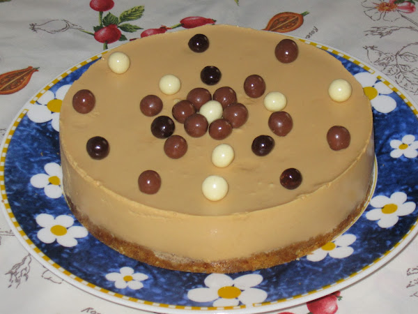 Desmoldamos y decoramos al gusto. Yo lo he hecho con bolitas de chocolate (bueno yo no, mi pinche), pero se puede decorar con nata (crema de leche), crocanti, virutas de chocolate....