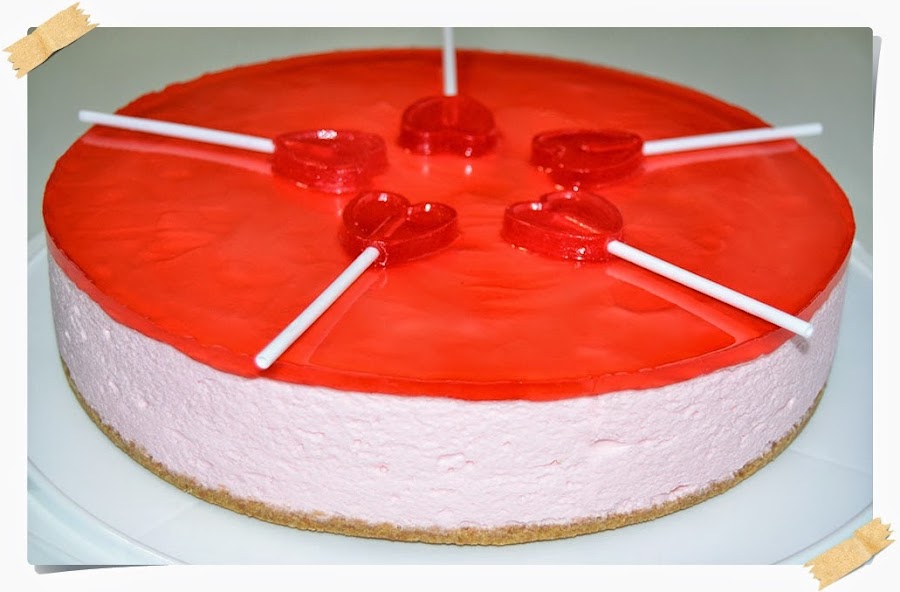 Por último, vamos a hacer la cobertura de gelatina de piruleta. Ponemos en agua fría 3 hojas de gelatina neutra y dejamos que se empapen bien. Echamos en un cazo las 10 piruletas junto con 100 ml de agua y removemos a fuego bajo hasta obtener un caramelo liquido y homogéneo. Agregamos la gelatina y removemos hasta que se integre del todo. Apartamos del fuego y dejamos que enfrié un poco la mezcla. Después la echamos poco a poco por encima de una espátula, para que caiga con menos fuerza sobre la tarta y así evitar que se rompa. Dejamos reposar en la nevera 2 horas y ya solo quedará adornarla (opcionalmente), desmoldarla y saborearla! :)