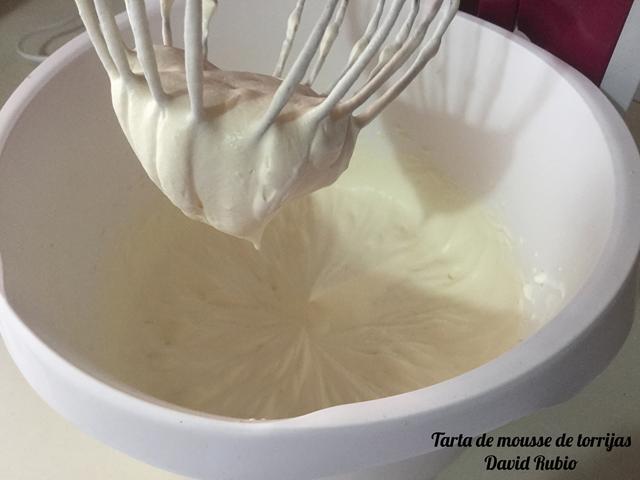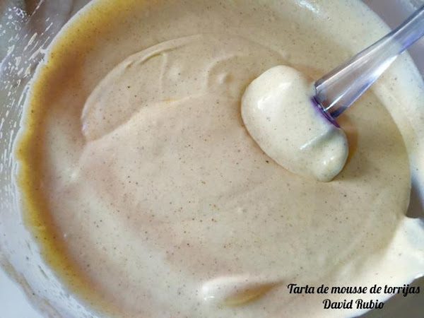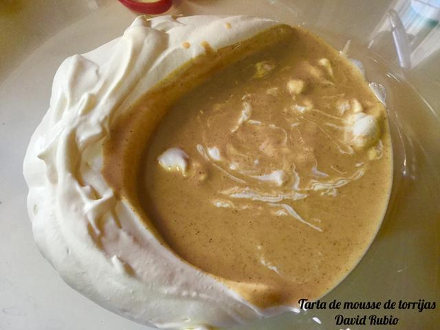 Cuando veamos que la crema de torrijas esta a temperatura ambiente, la mezclaremos con la nata montada (crema de leche) con movimientos envolventes de abajo hacia arriba, para que no se nos baje la nata (crema de leche).