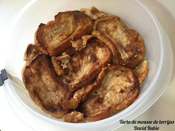 Ponemos las torrijas en el fondo de nuestro molde. Podemos recortarlas para llenarlo todo sin que se vean huecos. Yo utilice un molde de 23cm. y necesité 6 torrijas para la base. Reservamos en el frigorífico.