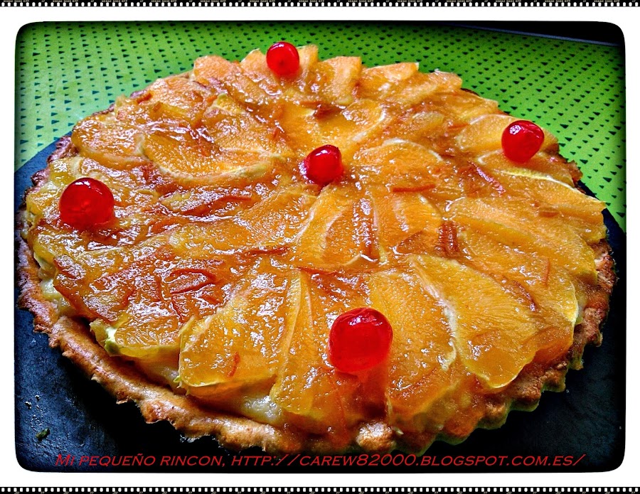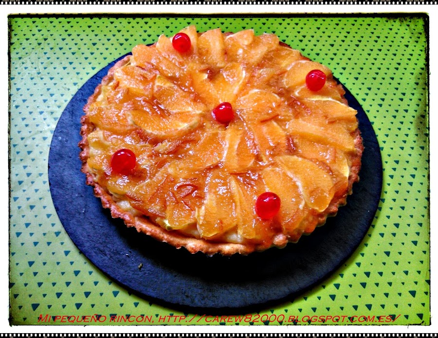 Sacamos la base de la tarta del molde y colocamos sobre un plato o bandeja, echamos la crema pastelera en una masa pastelera y rellenamos toda la base de la tarta sin dejar huecos, vamos colocando la naranja en laminas bien colocada por encima de la crema pastelera y por ultimo extendemos unas cucharadas de la Mermelada de Naranja Amarga, Conservas Juker.