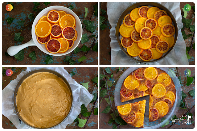 En un molde de 26 cm aproximadamente poner en la base papel de horno. Colocar las rodajas de naranja alternando las dos variedades y procurando que no queden huecos.