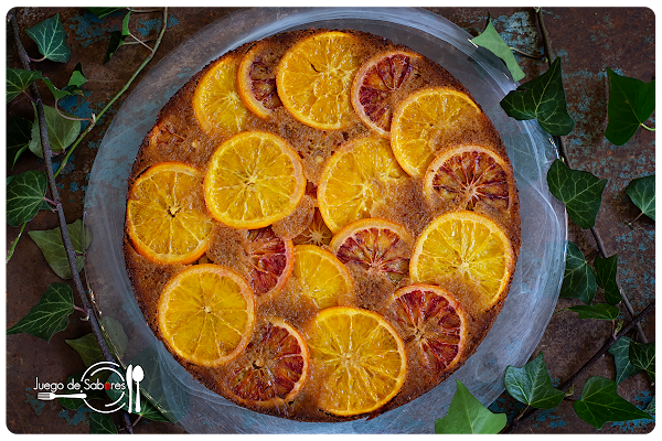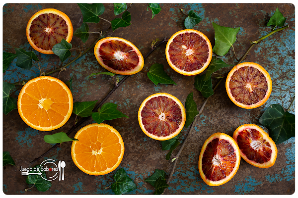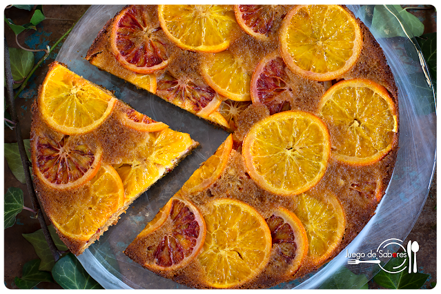 Si el Sol es fuente de vida y de salud, la naranja es su equivalente en el mundo vegetal. Me vino a la cabeza este pensamiento al ver el resultado de las fotos de la tarta de naranja que hoy os proponemos. Así colocadas las naranjas sobre una fuente redonda me pareció ver un Sol en todo su esplendor. Hemos jugado con dos variedades de naranjas, las navel y las sanguinas de intenso color rojo. El Sol también juega con tonos amarillos y rojos, sólo hay que imaginar las tormentas solares para ver toda esta gama de colores. Si todo nuestro universo gira alrededor del Sol, los comensales que degusten esta tarta de naranja también girarán alrededor del plato.