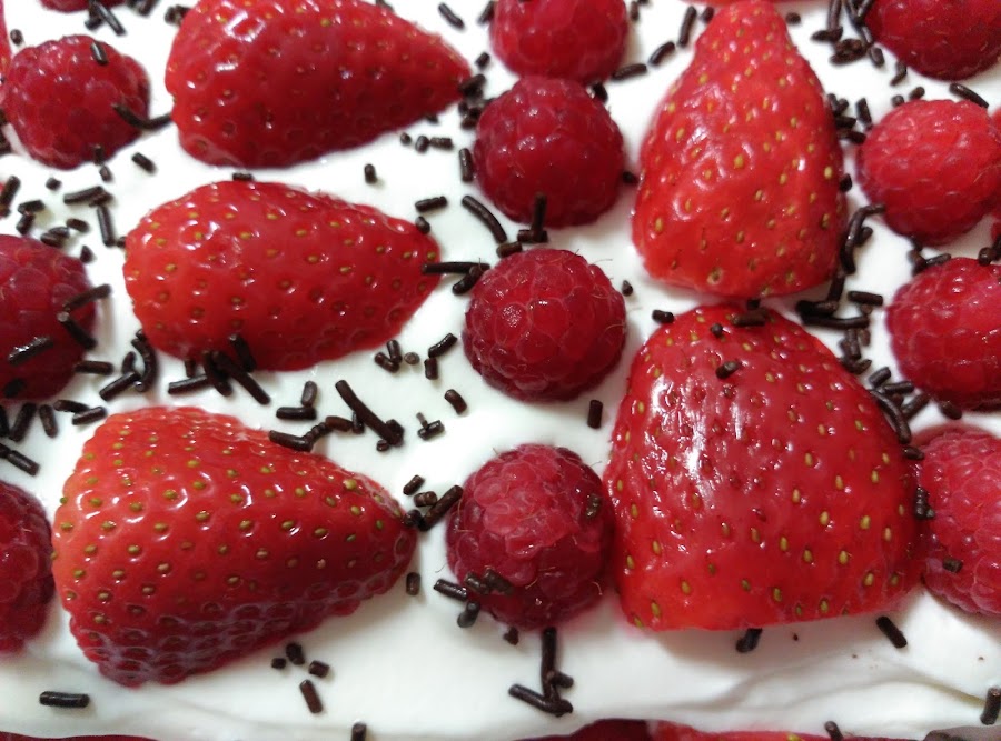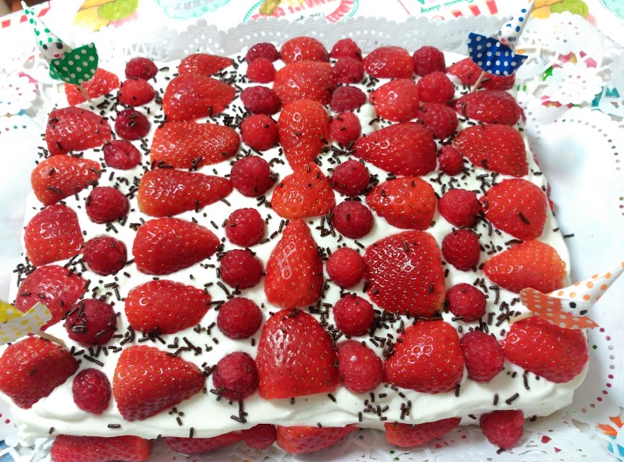 Cubrir con la nata (crema de leche) restante toda la superficie de la tarta. Adorna con las fresas restantes y las frambuesas.