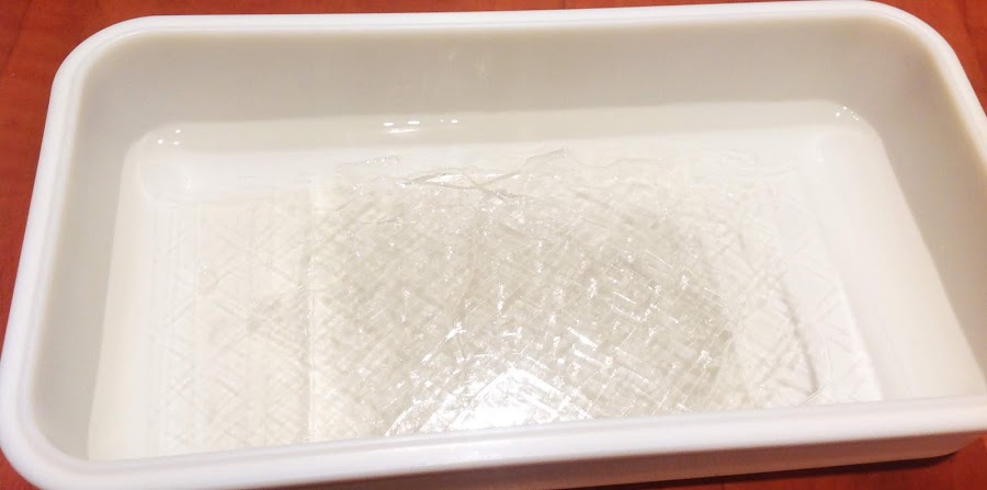 Corta cada hoja de gelatina en 3 trozos e hidrata en un poco de agua fría. Durante 5-7 MINUTOS.