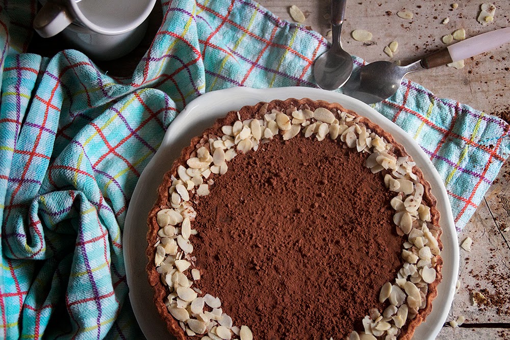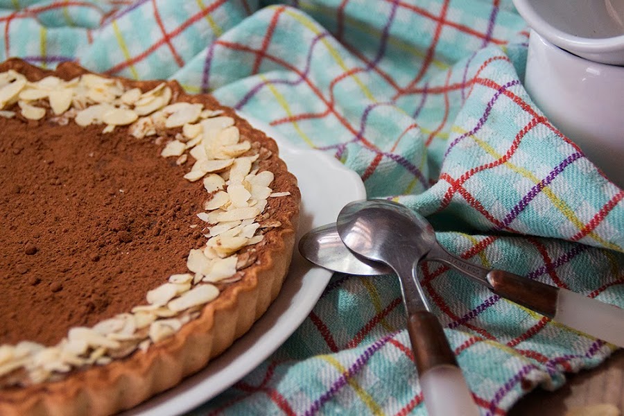 Sacamos de la nevera diez minutos antes de servir y espolvoreamos toda la superficie con cacao amargo en polvo y decoramos los bordes con almendra fileteada. Servimos a temperatura ambiente.