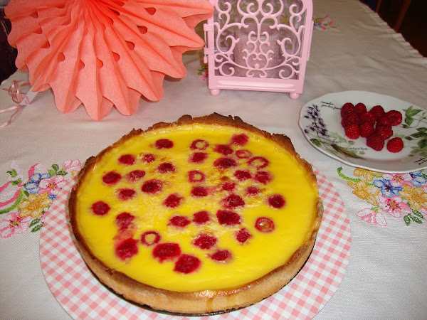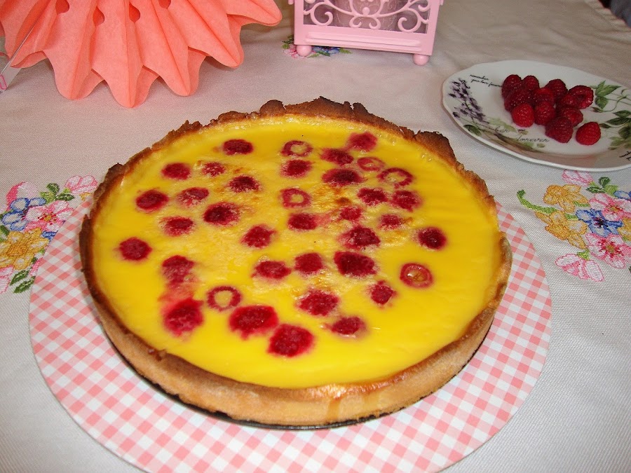 Luego preparamos una natillas, echamos sobre la corteza de la tarta y añadimos las frambuesas. Metemos en el horno a 215º C durante unos 15 minutos. Dejamos atemperar y luego si queremos podemos ponerlo en el frigorífico.