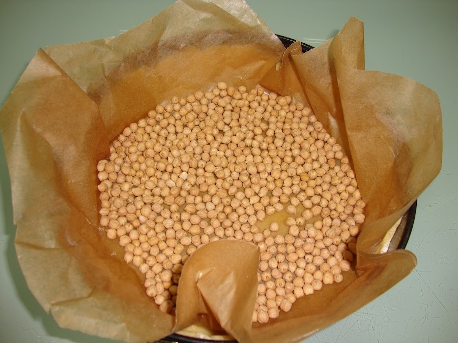 Calentamos el horno a 180º C y tapamos la masa con papel de horno y cubrimos con garbanzos o judías. Lo horneamos durante unos 15 minutos y reservamos.