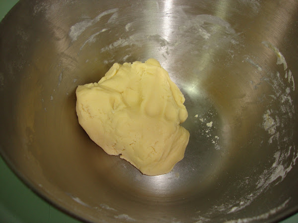 Añadimos la yema y las cucharaditas de agua mientras batimos rápidamente hasta que se forme una masa, luego formamos una bola con la masa y la ponemos en un cuenco tapada con film transparente y metemos en el frigorífico unos 30-40 minutos.