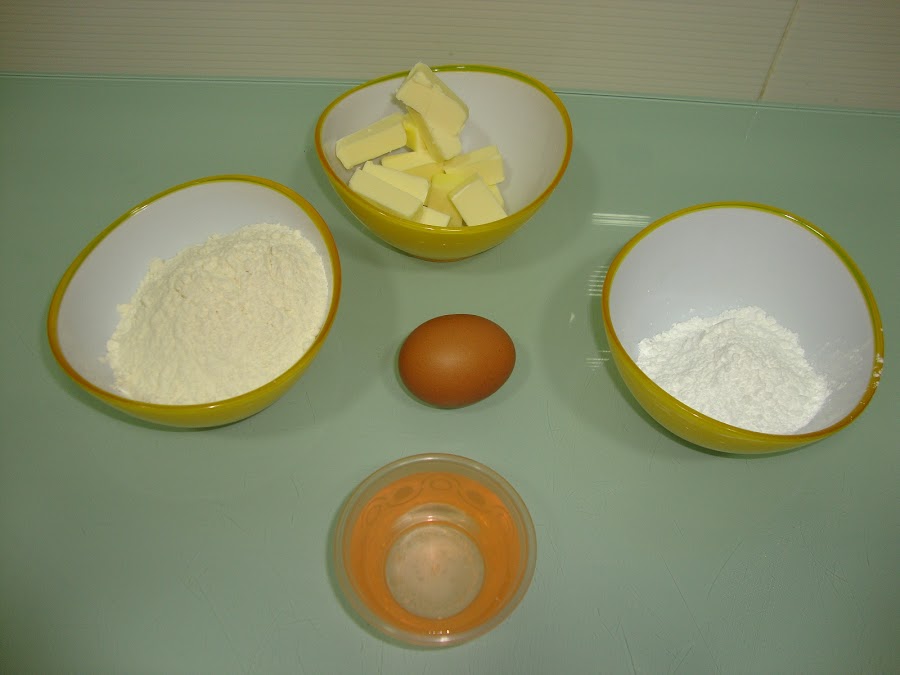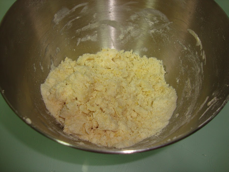 Ponemos en un cuenco la harina junto con el azúcar y la mantequilla fría y mezclamos hasta que queden como migas de pan.