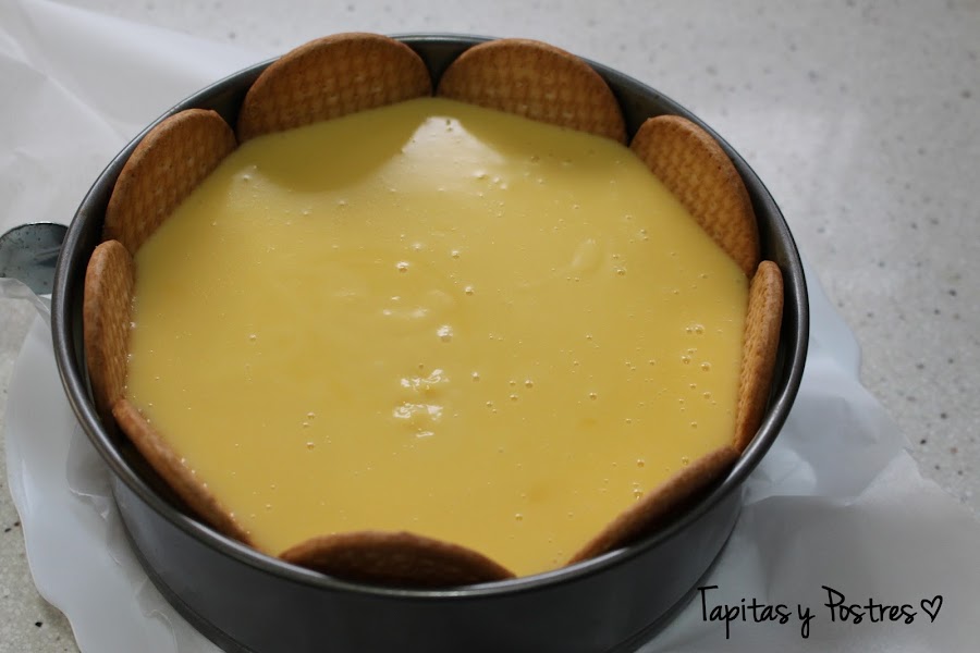 Y vertemos con cuidado la crema. Dejamos enfriar antes de guardar en la nevera. Estas tartas es mejor hacerlas el día antes.