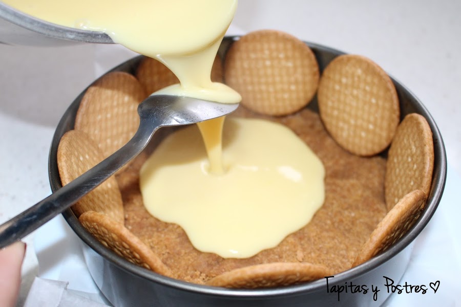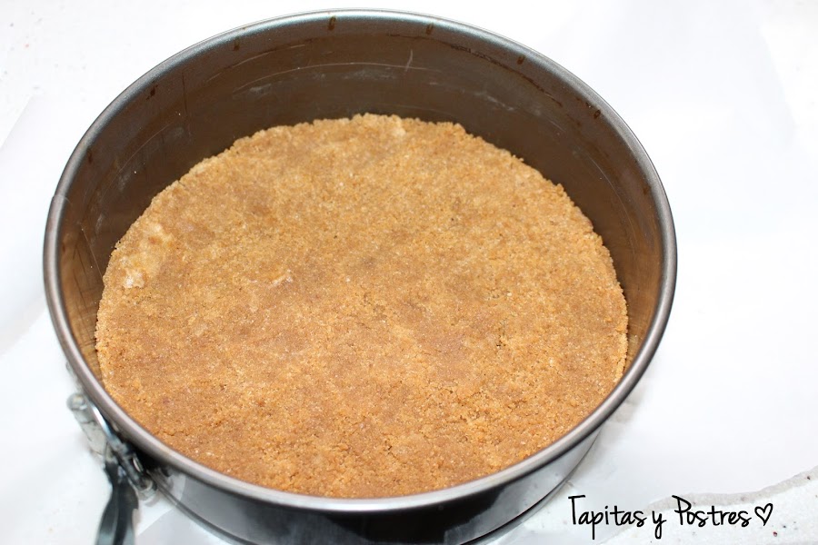 Forramos la base de un molde desmoldable. Dejamos en la nevera un rato.