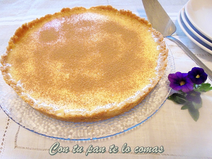 La idea principal era no usar el horno, y la segunda, que no me llevara más de media hora de preparación que es el tiempo que he aguantado dentro de la cocina. Con estos requisitos he echado mano de los típicos sobres de natillas o flan de toda la vida y para la base unas galletas maría hechas polvo, luego unas hojas de gelatina para cuajarla y a la nevera unas cuantas horas. Como ves es facilísima...¿Que si está buena? ¡¡Un montón!!