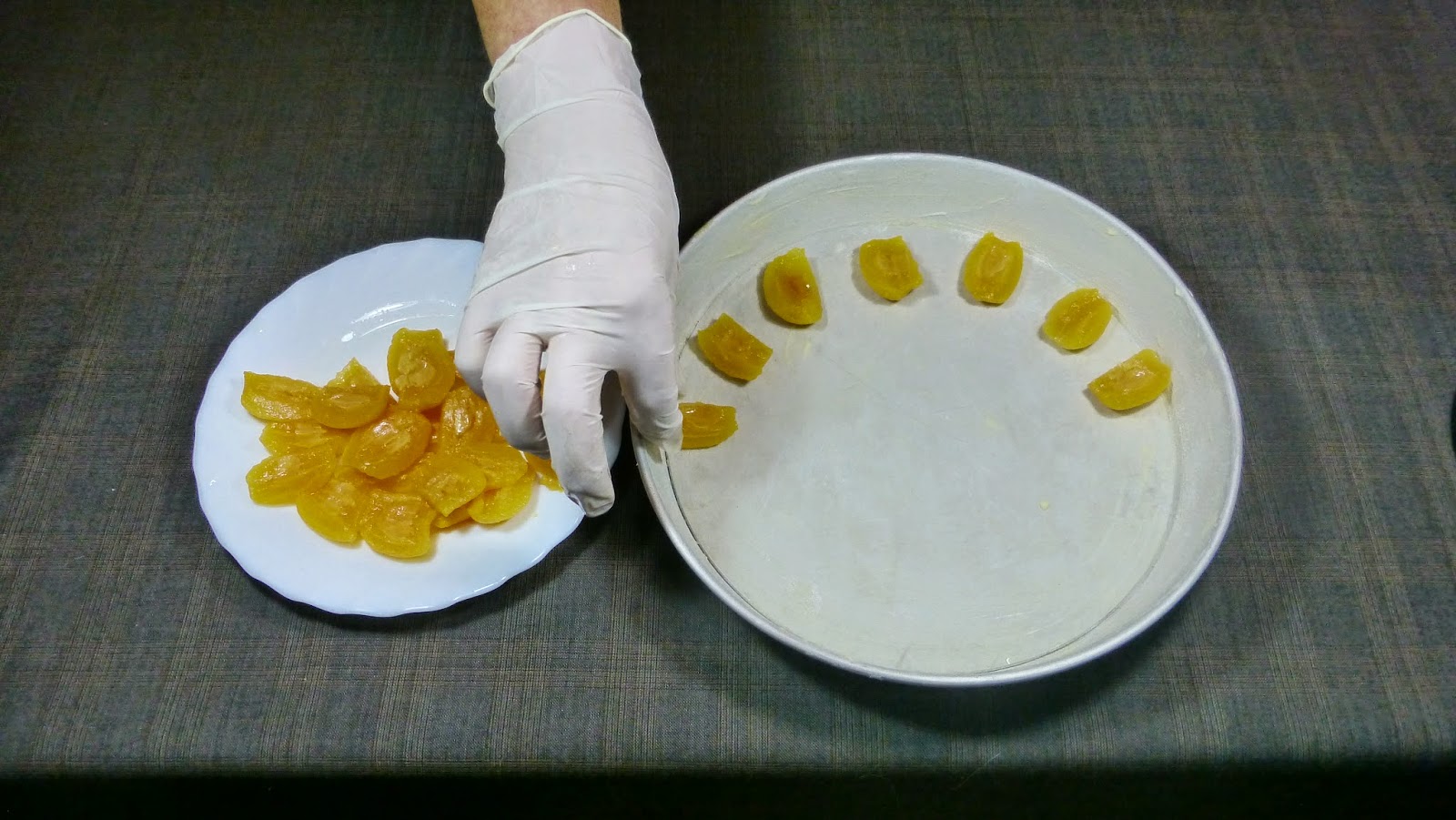 Cortamos los Nísperos en almíbar Ruchey en cuatro o seis partes (según prefieras) y los repartimos por el molde, con el lado exterior hacia abajo.