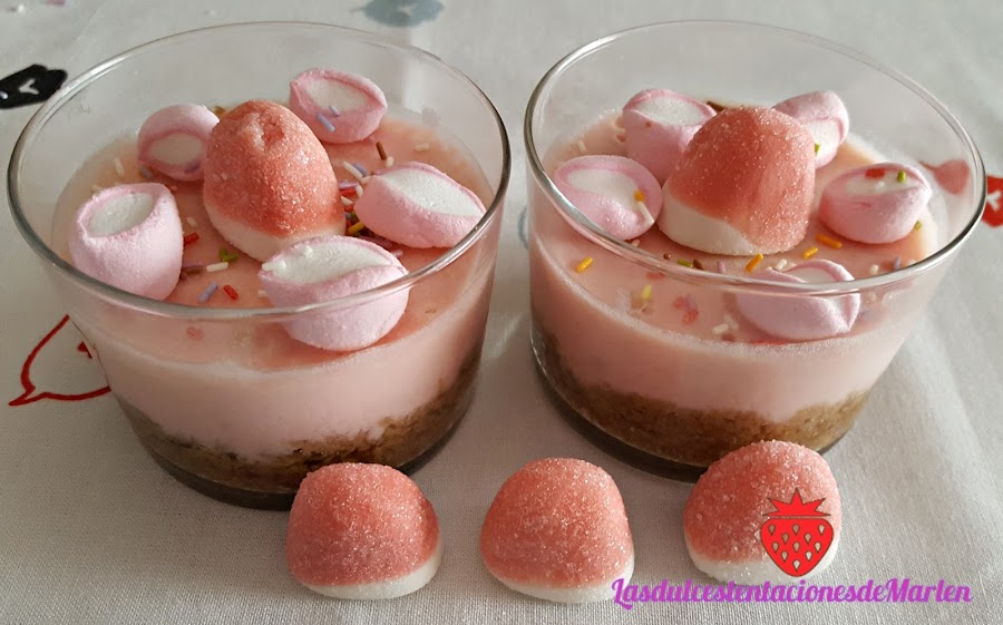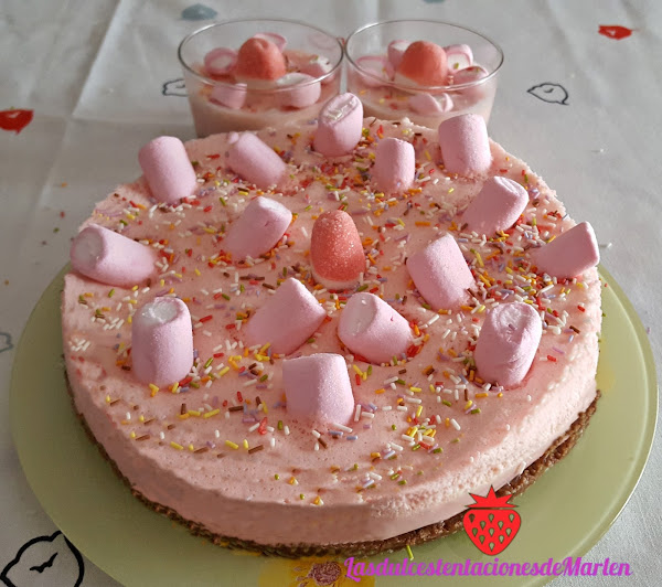 "Quería contaros que me quedo un poquito de preparado de tarta y he hecho un poquito de base, lo mismo que la de la tarta con galletas, mantequilla y cacao en polvo, y le he puesto el resto de preparado que me ha quedado..Me ha quedado un par de vasitos estupendos de tarta, que se cuajan en un par de horas. Ustedes podéis utilizar un molde de 22 cm. y os quedará justo el preparado de la tarta"