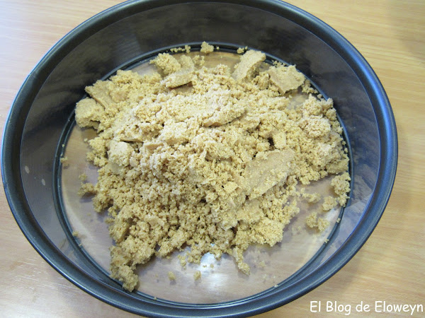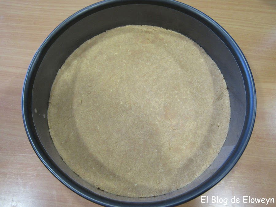 Un último apunte: Usé un molde desmontable con base de cristal, y no puse nada debajo. Puse la base de galletas directamente sobre el cristal y quedó un poco pegado. Quizá hubiese ido mejor poner en la base un poco de spray desmoldante, o un papel de hornear para que no quedase tan pegado. De todas formas, se despegaba pasando una espátula por debajo.