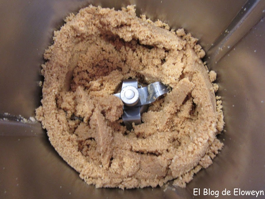 Si usáis la Thermomix, mezclar unos 5 segundos a velocidad 5. Si usáis una picadora, picad las galletas con la mantequilla hasta que os quede una mezcla con este aspecto: