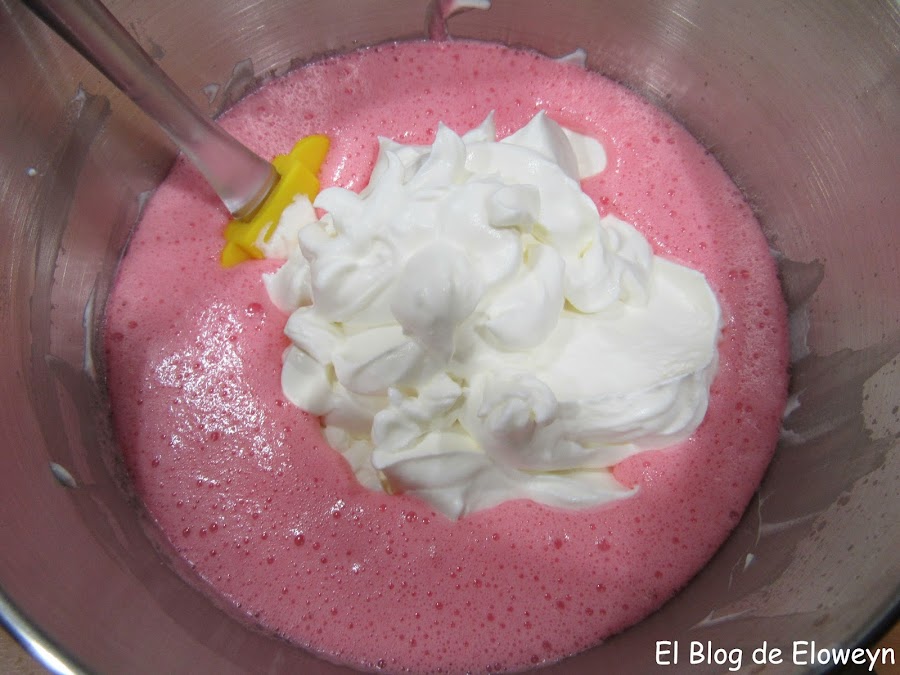 Removemos la mezcla con una espátula. Lo hacemos con movimientos envolventes, con cuidado de que no se baje mucho la nata (crema de leche).