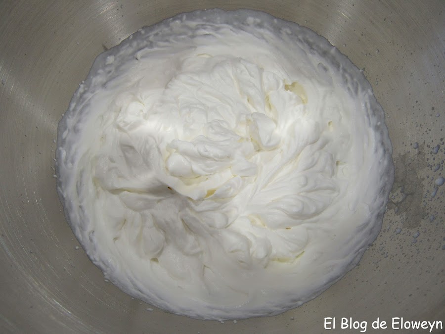 Una vez montada la nata (crema de leche), reservamos en la nevera hasta que la mezcla de las nubes haya llegado a temperatura ambiente. Cuando esté a temperatura ambiente, añadimos la nata (crema de leche) a las nubes