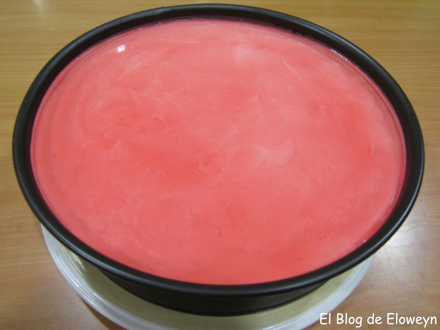 Ponemos el molde en la nevera y esperamos a que el relleno haya cuajado antes de hacer la gelatina. Yo hice el relleno por la noche y la gelatina, al día siguiente de buena mañana. A la hora de comer ya estaba lista la tarta.