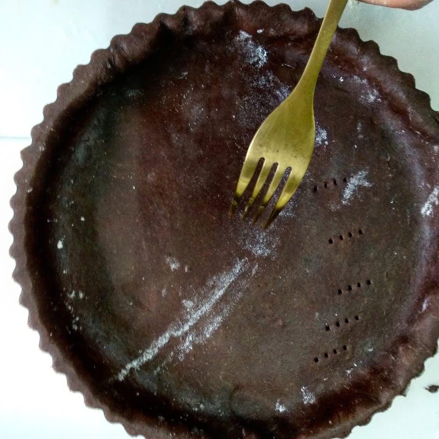 Comenzamos con la masa. Mezclamos la harina, sal, chocolate en polvo y azúcar y la añadimos la mantequilla en tacos. Trabajamos con los dedos hasta conseguir una textura arenosa y le añadimo el huevo. Mezclamos y formamos una bola que llevaremos al frigorífico al menos una hora.