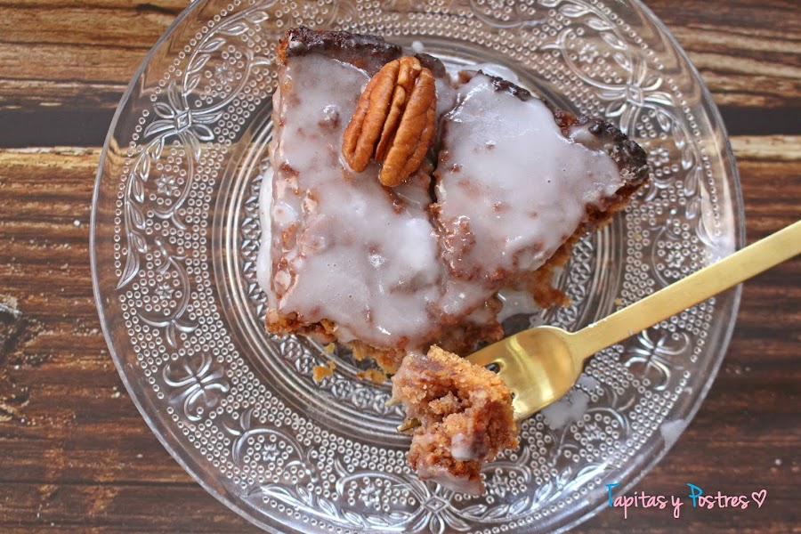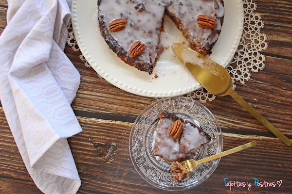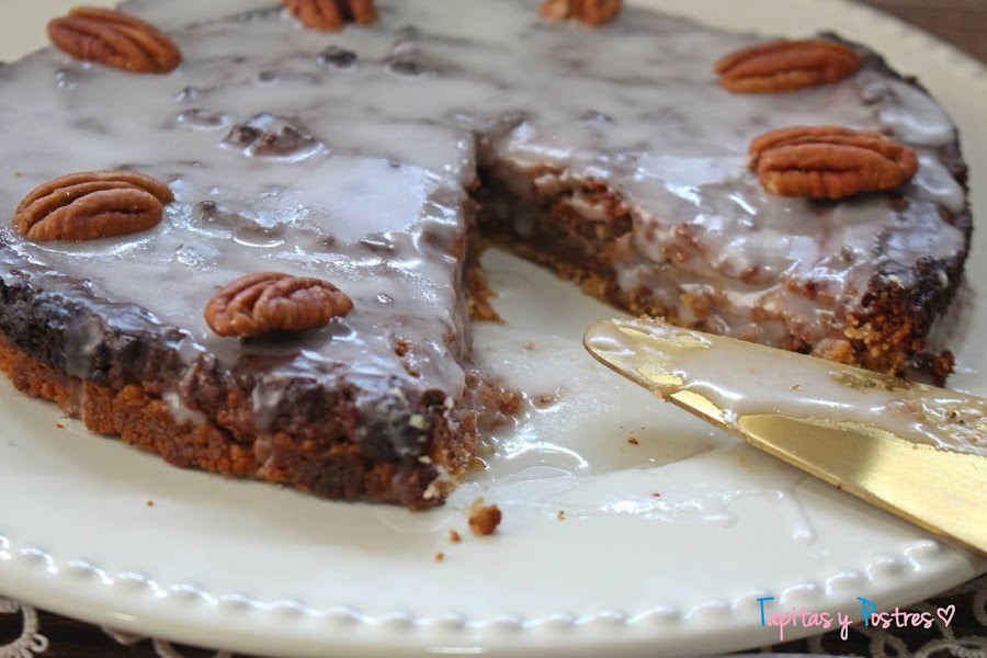 Es una tarta bajita, de textura un poco apelmazada pero riquísima de sabor, con el toque crujiente de las nueces y el dulzor del glaseado.