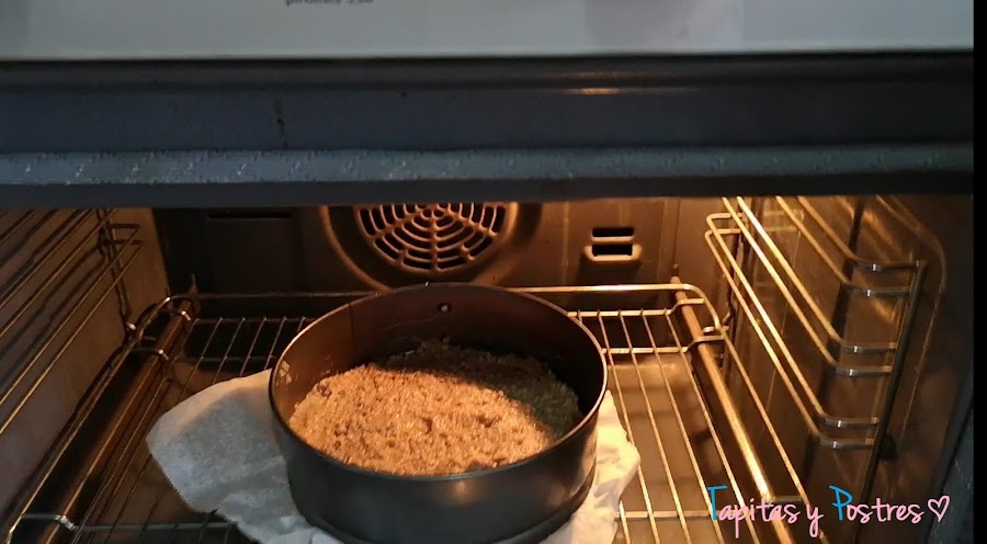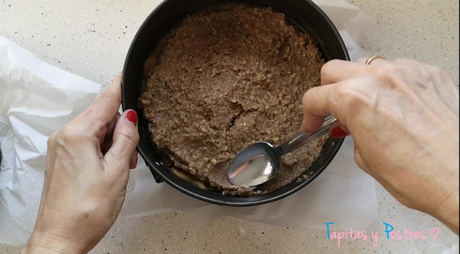 Ponemos esta mezcla en el fondo de un molde forrado con papel vegetal. Lo dejamos en la nevera una media hora.