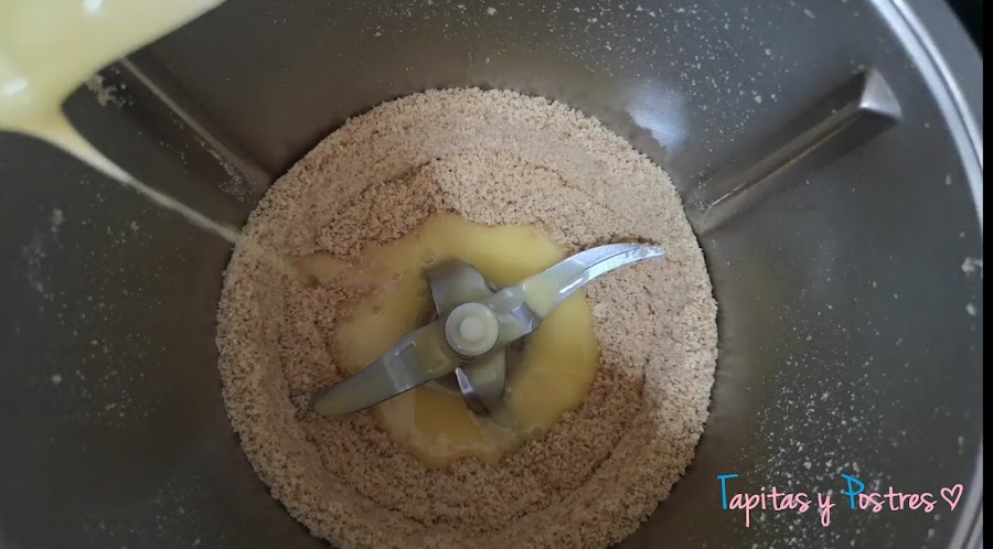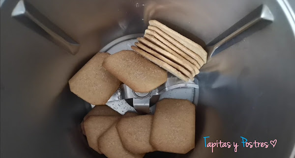 Preparamos la base triturando las galletas con una batidora. Yo lo hice con thermomix, 25 segundos a velocidad 4.