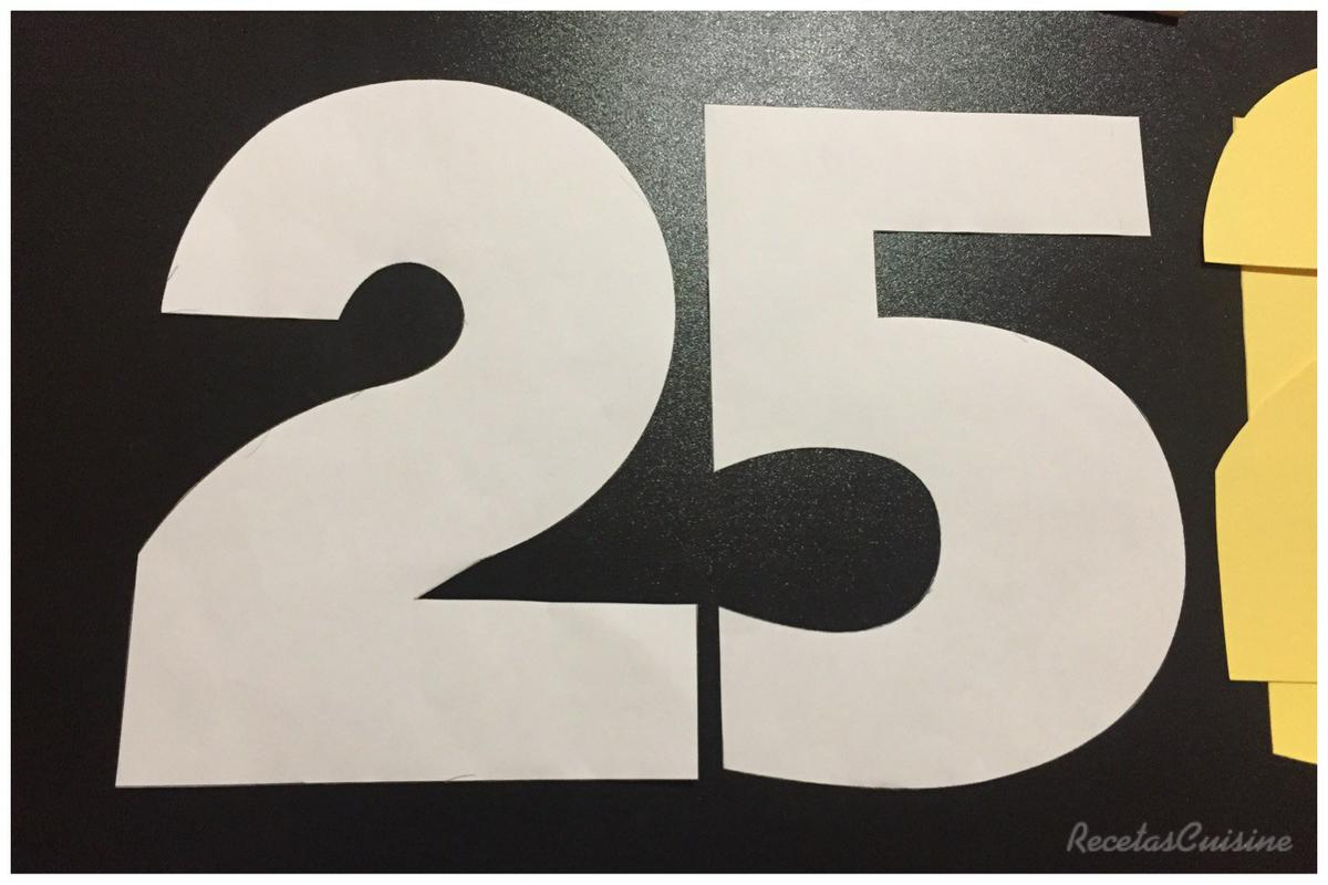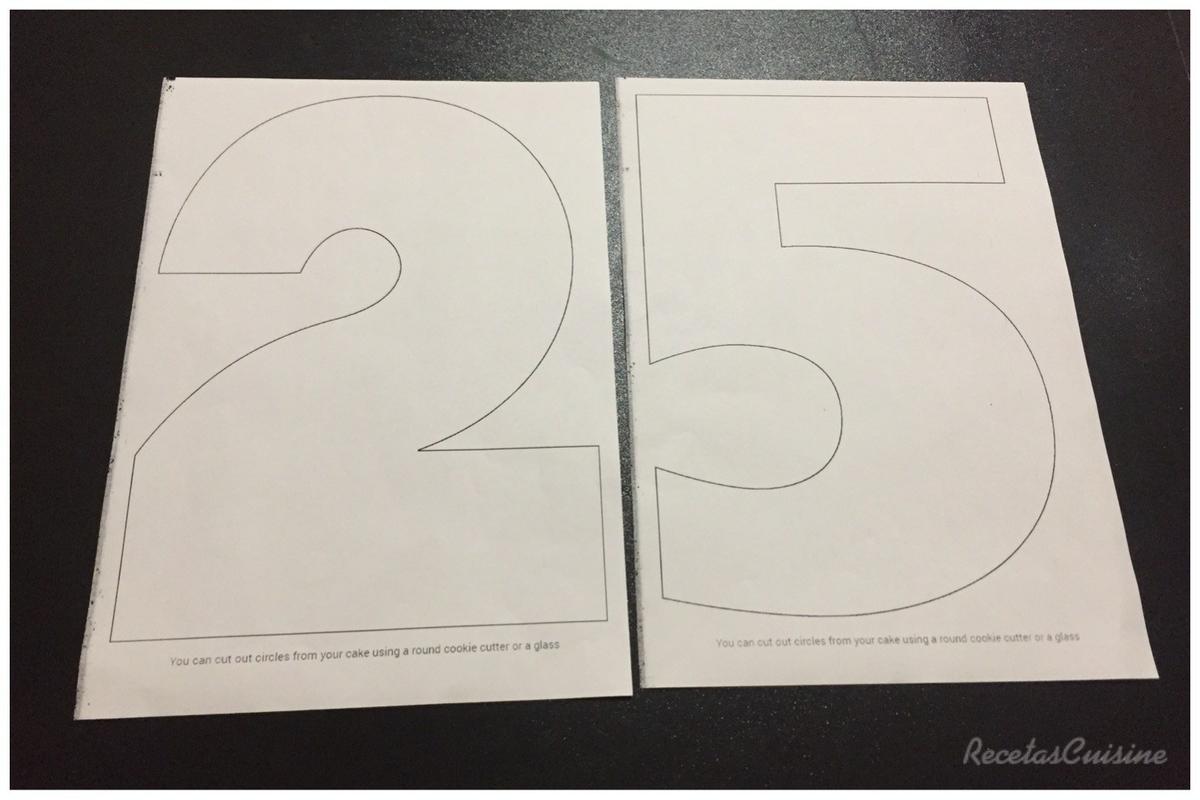 Lo primero de todo, será preparar la plantilla para hacer los números. Yo he descargado las imágenes de la página Bakewithstork (al final de la receta os dejamos un PDF para que podáis imprimirlos) y con la impresora, he sacado cada número en un folio de tamaño DIN A4. Podéis hacerlo imprimiendo otros números que os gusten, desde un editor de texto, o buscando imágenes en Google. Con la cantidad que indica la receta, da para hacer los cuatro números que necesitaremos.