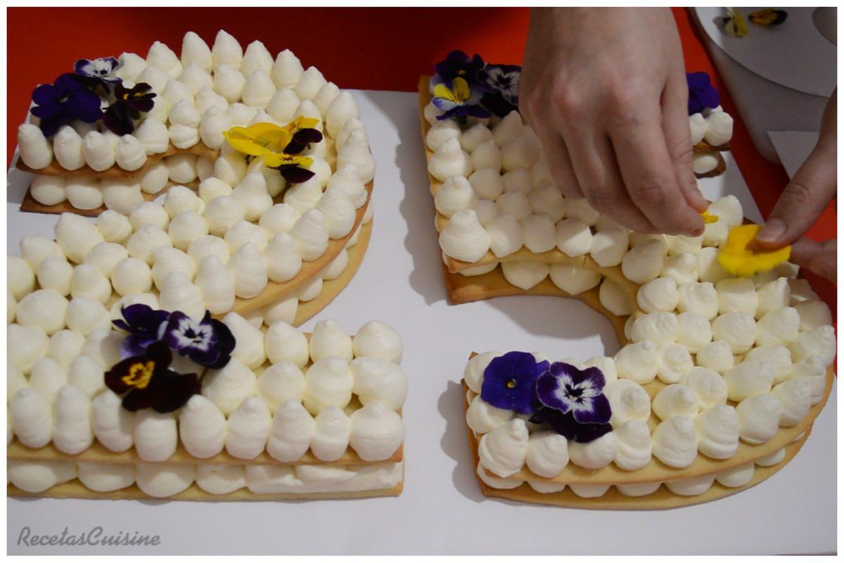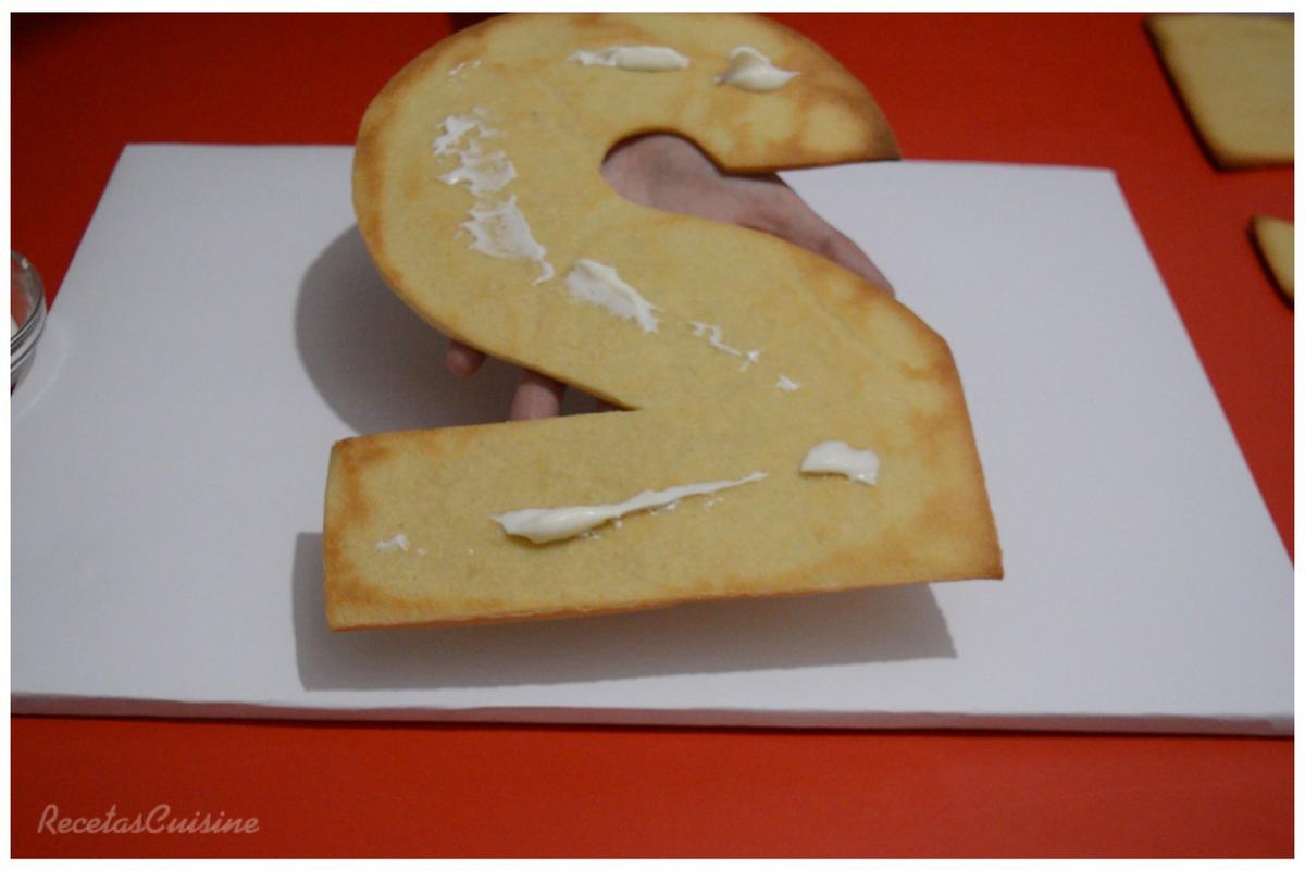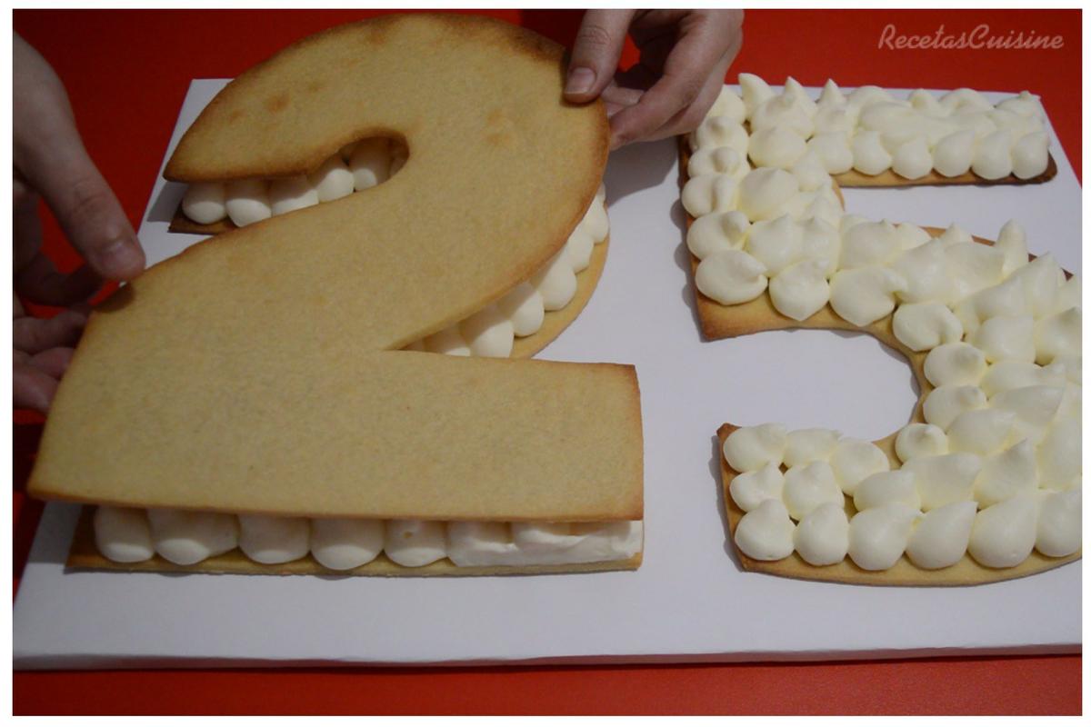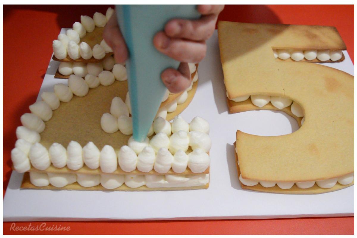 3. Una vez tengamos toda la base cubierta, colocamos encima los otros números, con cuidado al manipularlos. Acomodamos la galleta suavemente, no hace falta presionar demasiado, sólo lo justo para que la galleta quede asentada sobre la crema.
