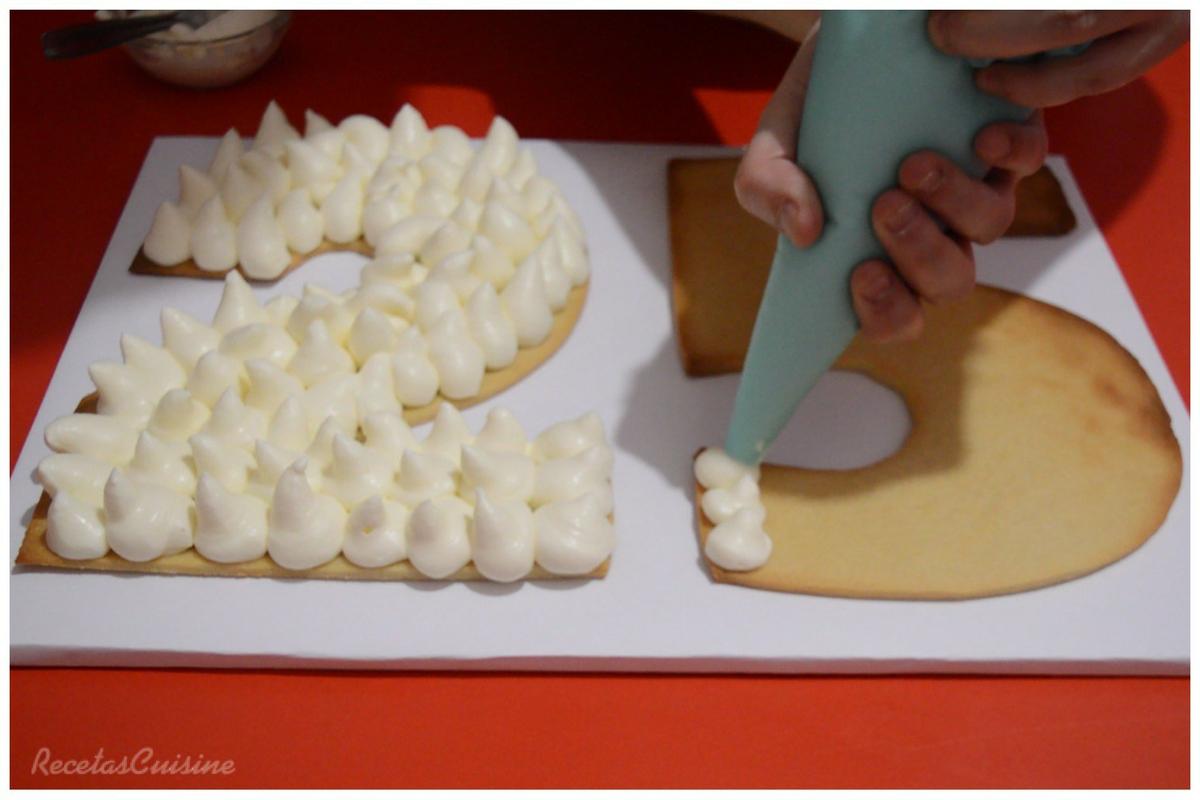 6. Añadimos la gelatina y batimos un poquito más, hasta que terminemos de montar la nata (crema de leche) y por lo tanto esté bien firme. Vamos controlando por el bocal, y si hace falta abrimos y miramos cómo va. Procuraremos no pasarnos batiendo, o podríamos cortar la nata (crema de leche). Para comprobar que está firme, podemos coger el bol e inclinarlo, si la crema no se vence, lo tendremos listo. Pasamos la crema a una manga pastelera y repetimos el proceso para preparar el relleno con el que cubriremos la superficie de la tarta en caso de que lo vayamos a necesitar. Como ya he comentado, si vuestros números son más finos porque necesitáis una tarta más pequeña, o la váis a hacer de una sola cifra, con hacer el relleno una vez, será suficiente.