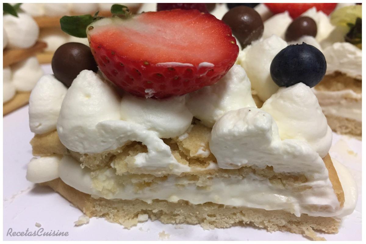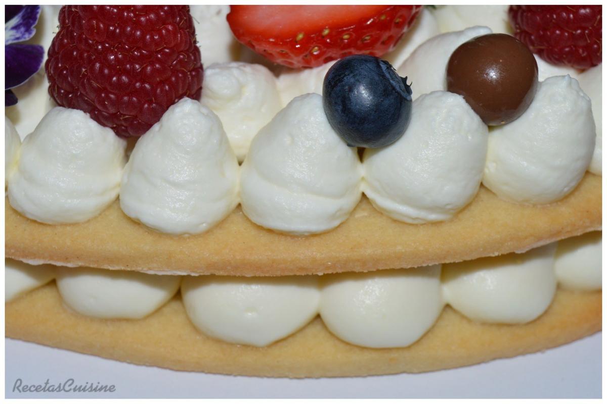 Este tipo de tarta, se puede hacer también con bizcocho genovés, hojaldre, pasta brisa… más adelante, lo repetiré con alguna de estas masas, por probar otra forma. En esta ocasión, elegí hacerlo con galleta de almendra porque me gusta mucho. Además, es una masa muy manejable que nos permite trabajar muy bien, y viendo el resultado, ha sido una magnífica elección. La textura suave de la galleta, acompañada de la crema lo hace un pastel muy agradable de comer, está delicioso! Visualmente es una pasada, y encima, todo lo que tiene de vistoso, lo tiene luego de rico.