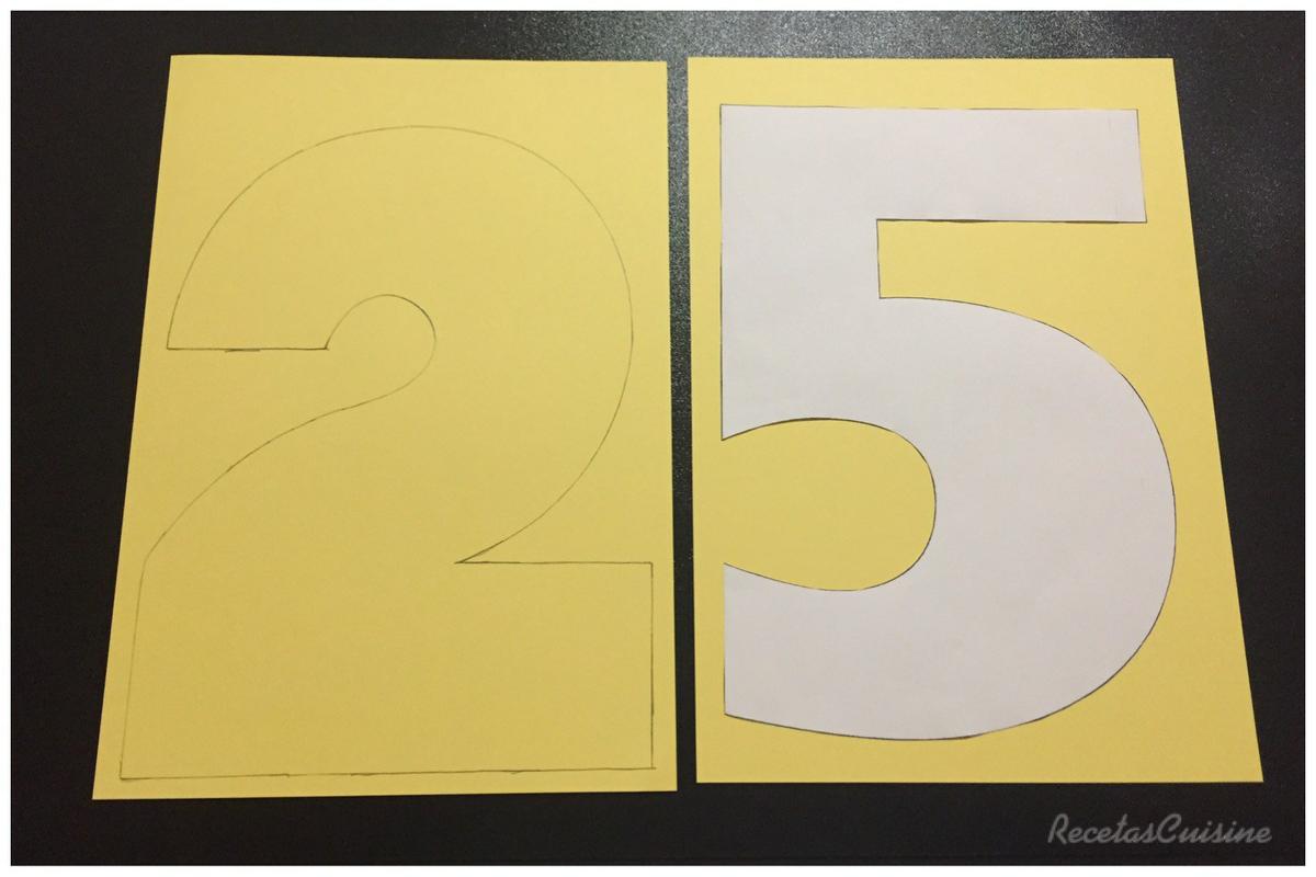 Una vez tengamos los números impresos en papel, los recortaremos siguiendo el margen, los pasaremos a una cartulina, y volveremos a recortar con la tijera para obtener la forma con la que trabajaremos sobre la masa. Yo recorté un poquito más el número 2 de un lado, para igualarlo al otro número que iba a utilizar; si os fijáis en las imágenes veréis la diferencia. En la receta que yo he seguido, usaban la plantilla sólo de papel, pero yo he preferido hacerlo también en cartulina, que como es más rígida, a la hora de cortar la forma, nos permite trabajar con más fiabilidad. Si sois apañaditos, y queréis hacerlo directamente en papel, podéis saltaros este paso de la plantilla en cartulina.