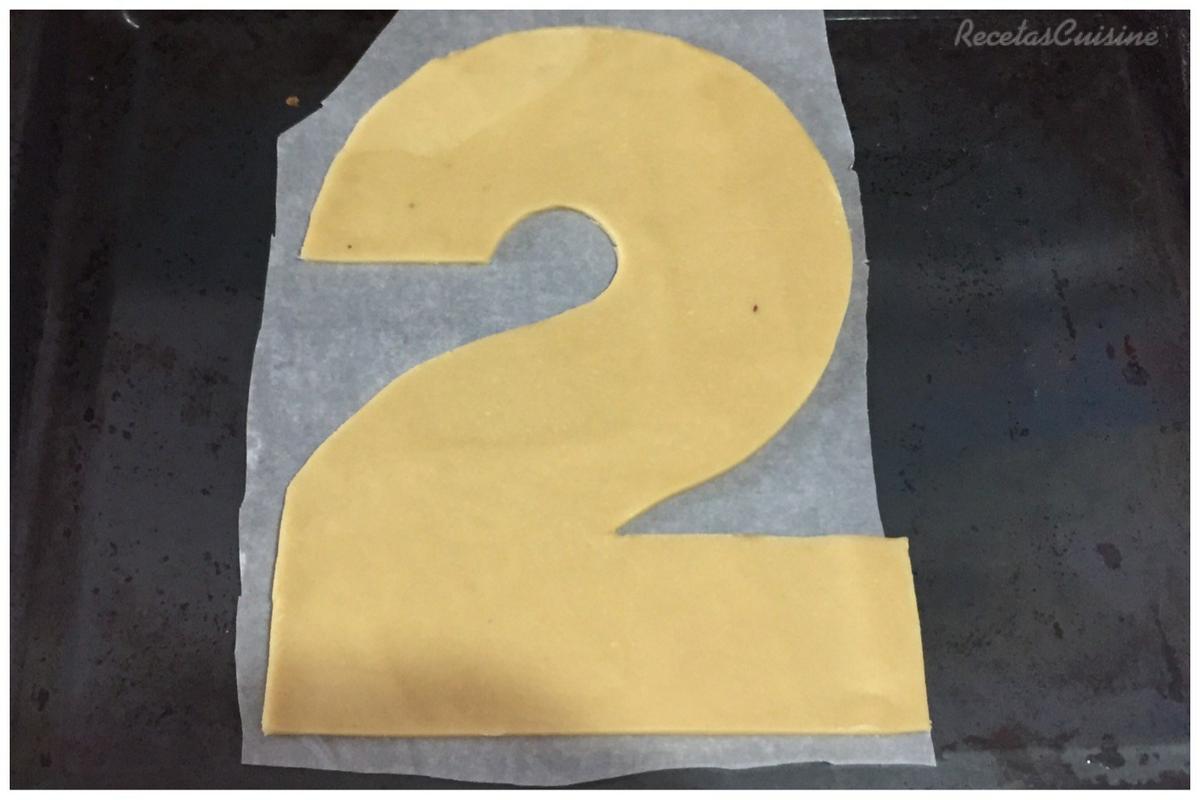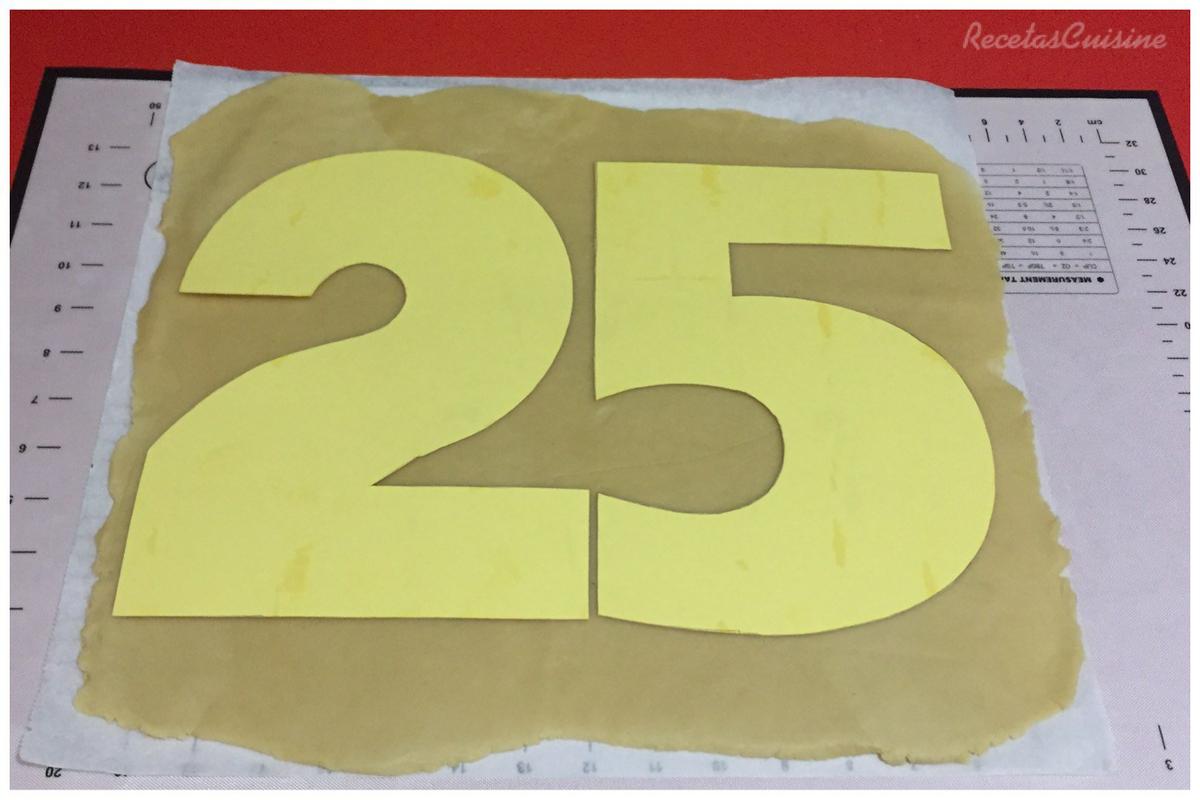 14. Repetimos el proceso para hacer los otros dos números que nos faltan. Con el sobrante que nos quede de recortar estos otros números, lo unimos formando una bola, lo estiramos y podemos sacar formas con un cortador para hacer galletas y así aprovechar la masa. Pero si en ese momento no vamos a gastarlo, podemos congelarlo envuelto en film para utilizar otro día.