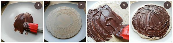 El primer paso es "fijar" la tarta al plato donde la vamos a servir para poder trabajar con ella. Para ello, con la ayuda de una lengua, comenzamos untando un poco de crema de cacao en el fondo del plato para que se pegue bien la primera oblea. La colocamos centrada y, de nuevo, añadimos crema de cacao, esta vez sobre la oblea, y de nuevo ayudándonos de la lengua, lo extendemos bien para que la capa sea fina. Es importante hacerlo así porque si ponemos demasiada crema de cacao la tarta quedará empalagosa, demasiado dulce para la mayoría de paladares.