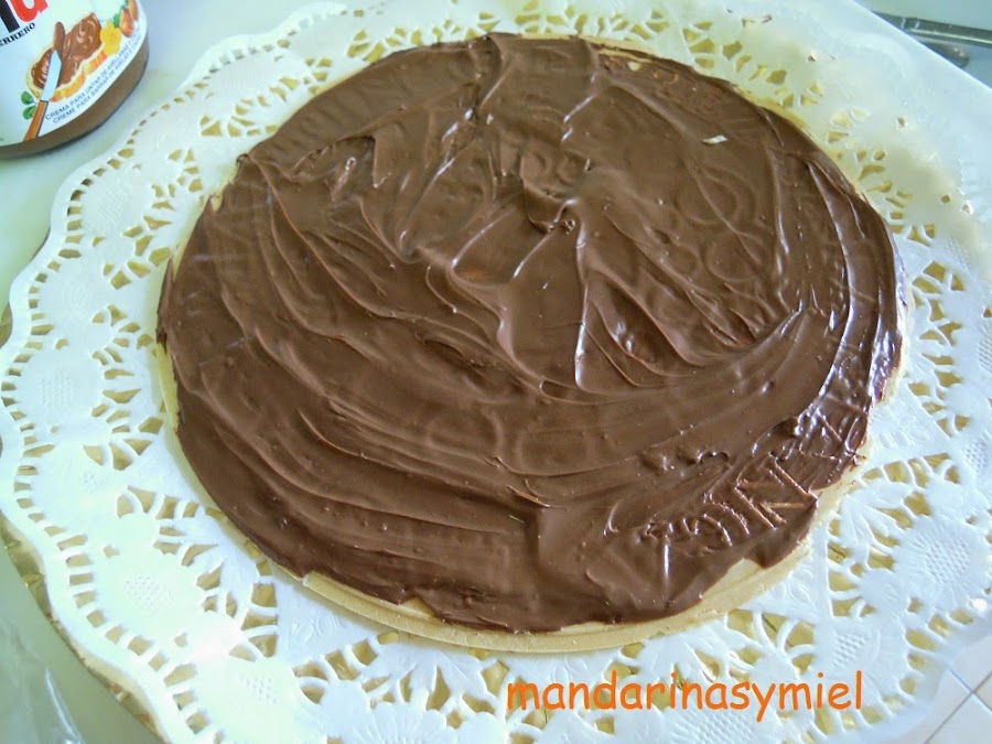 Extiende la nutella sobre la oblea, pon una capa fina y hazlo con cuidado para que no se te rompa, utiliza una espátula o un pincel.