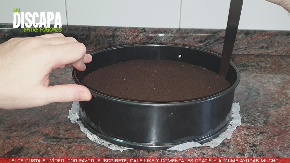Yo estoy utilizando un molde de unos 23 centímetros de diámetro al que le he puesto papel de horno en la base para que sea más fácil desmoldarlo.