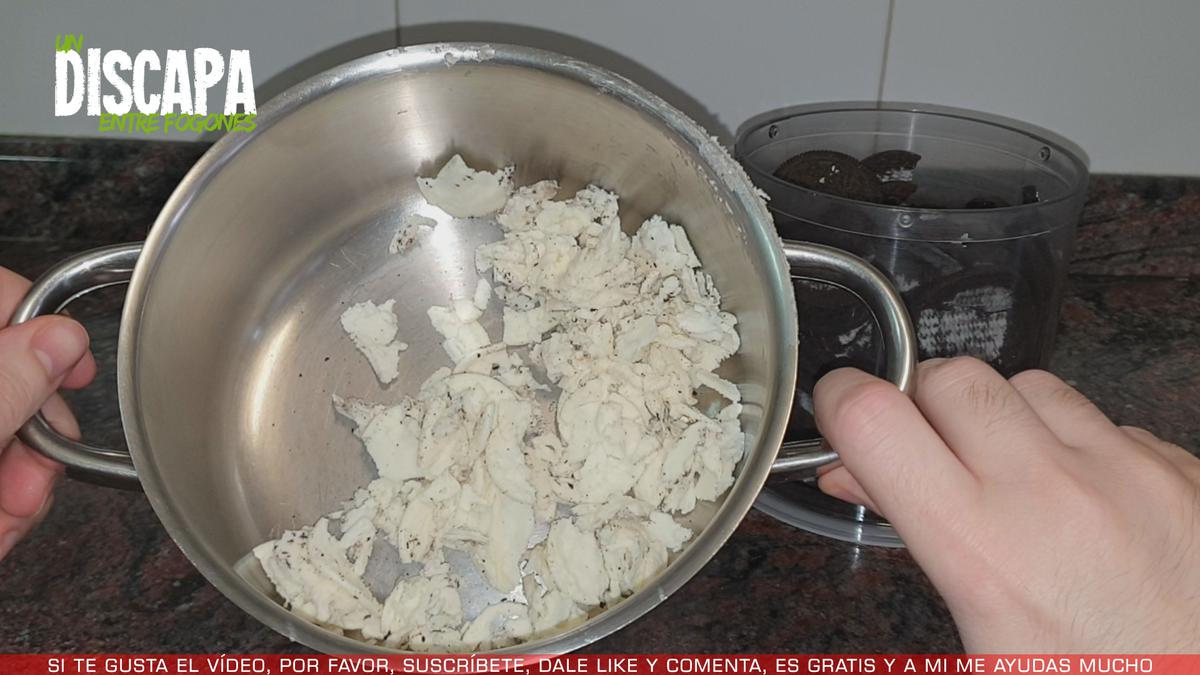 7Ahora en el cazo donde teníamos el relleno de las galletas vamos a añadir la nata (crema de leche) líquida, el queso crema y el azúcar.