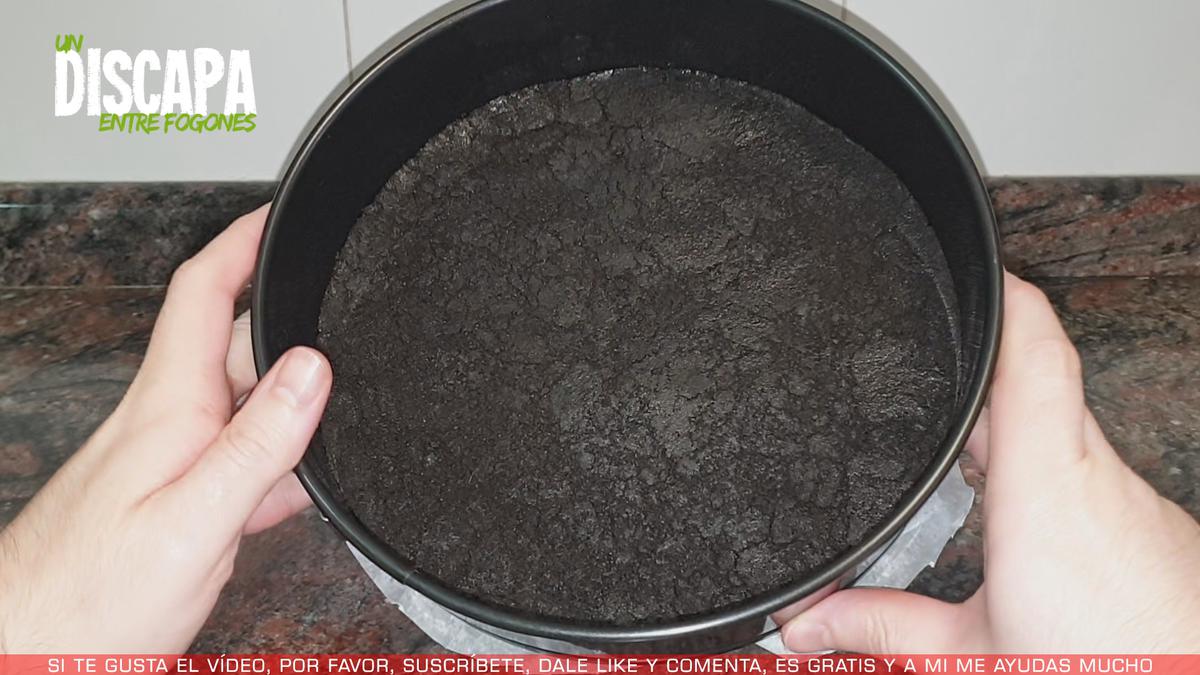 Repartimos bien por la base la mezcla de mantequilla y galleta para que quede lo más repartido posible y vamos haciendo una ligera presión para que se quede lo más compacta posible.